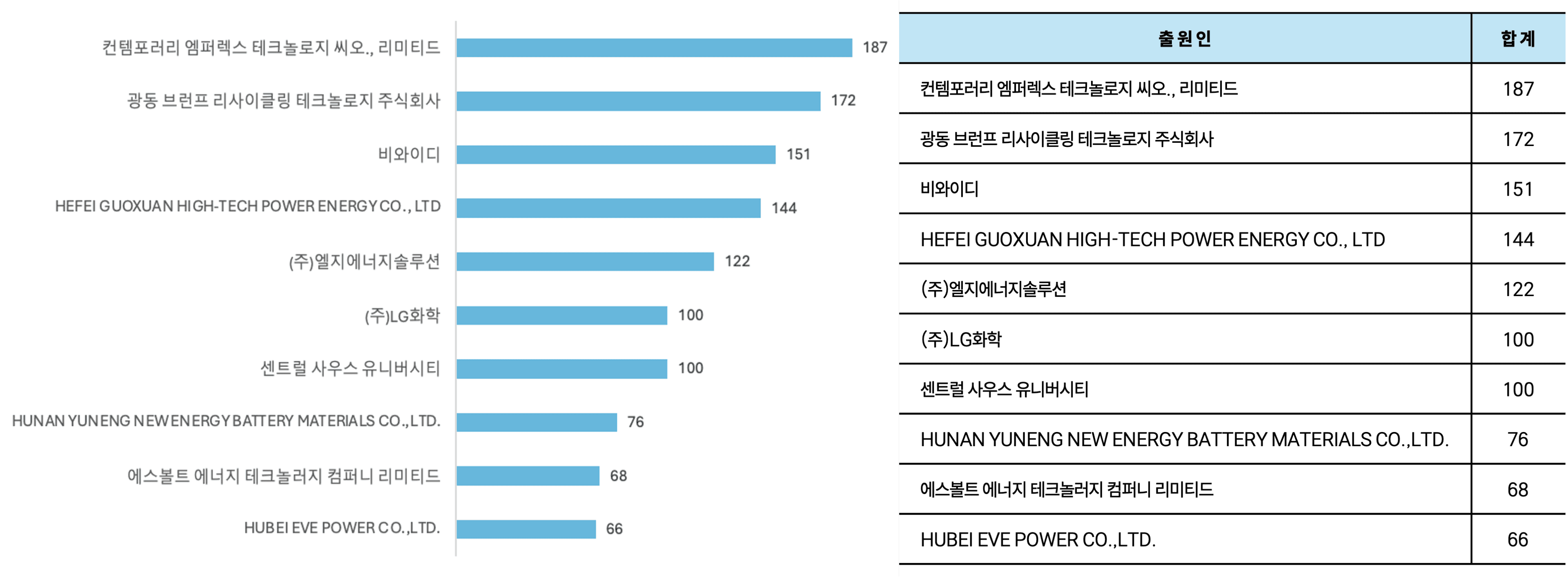 또한 BYD 역시 블레이드 배터리 구조 등 차별화된 설계 기술을 중심으로 적극적인 권리 확보에 나서고 있습니다. 이러한 상위 출원인 분포는 LFP 기술 경쟁이 단순 소재 개발을 넘어 구조 설계 및 시스템 통합 영역까지 확장되고 있음을 보여줍니다.